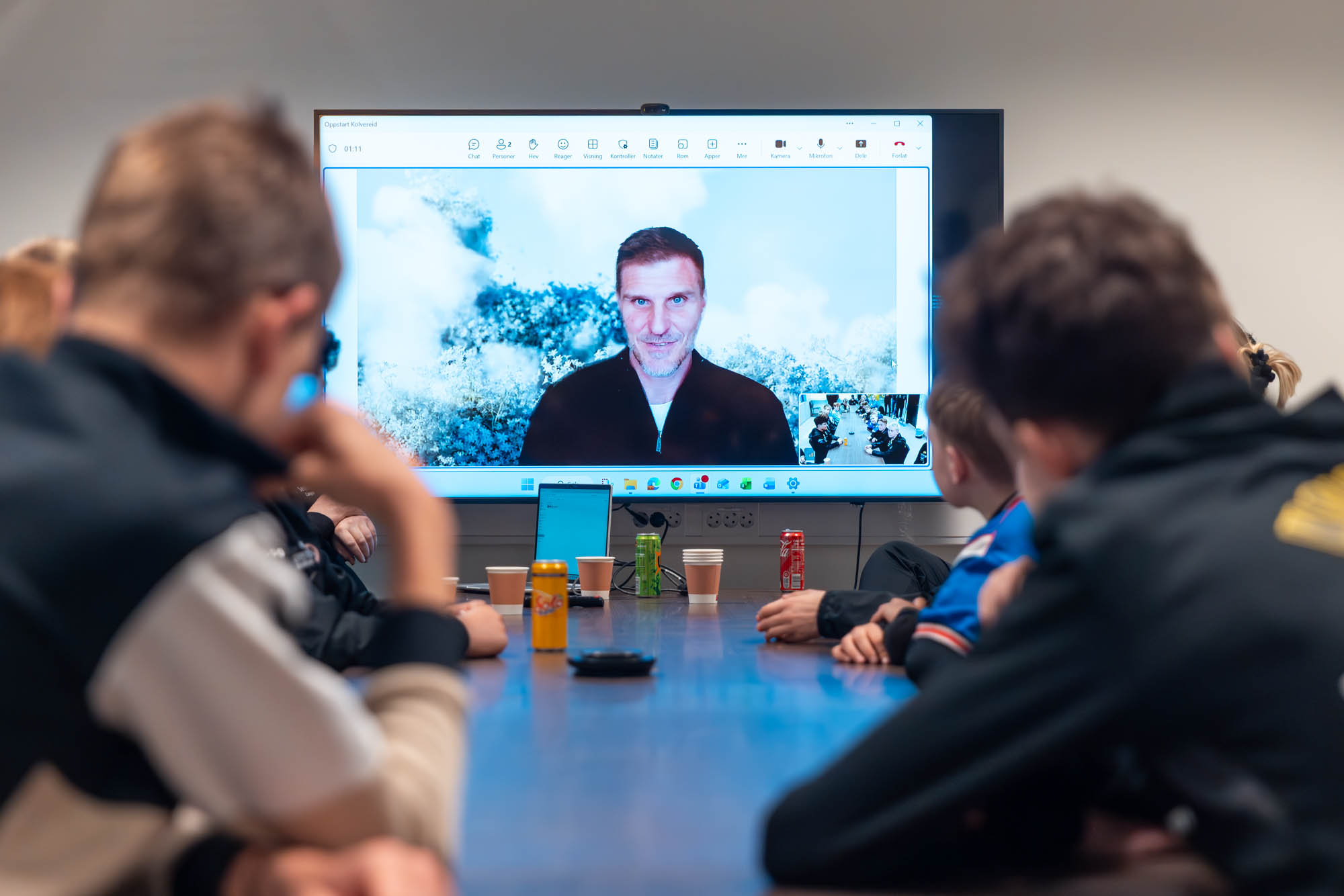 Bjarte Myrhol er koblet på storskjerm forran et spent G14 lag.